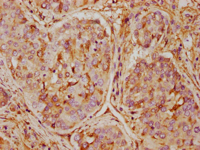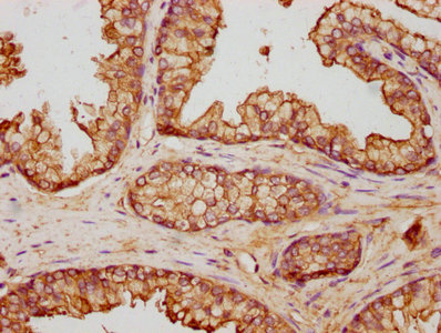IHC image of CSB-PA001846YA01HU diluted at 1:500 and staining in paraffin-embedded human prostate cancer performed on a Leica BondTM system. After dewaxing and hydration, antigen retrieval was mediated by high pressure in a citrate buffer (pH 6.0). Section was blocked with 10% normal goat serum 30min at RT. Then primary antibody (1% BSA) was incubated at 4°C overnight. The primary is detected by a biotinylated secondary antibody and visualized using an HRP conjugated SP system.