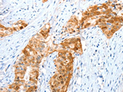 The image on the left is immunohistochemistry of paraffin-embedded Human cervical cancer tissue using CSB-PA441788(ANXA8 Antibody) at dilution 1/35, on the right is treated with fusion protein. (Original magnification: ×200)