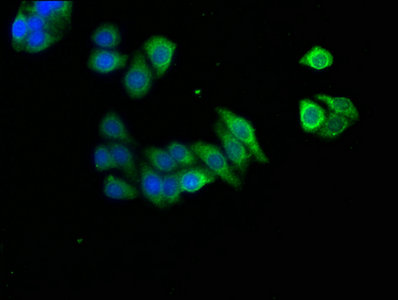 Immunofluorescence staining of HepG2 cells with CSB-PA001858HA01HU at 1:166, counter-stained with DAPI. The cells were fixed in 4% formaldehyde, permeabilized using 0.2% Triton X-100 and blocked in 10% normal Goat Serum. The cells were then incubated with the antibody overnight at 4°C. The secondary antibody was Alexa Fluor 488-congugated AffiniPure Goat Anti-Rabbit IgG(H+L).
