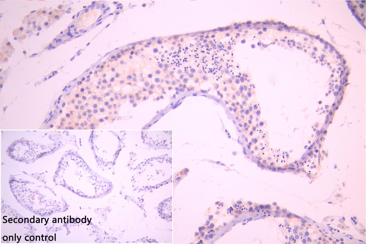 IHC image of CSB-PA897585LA01HU diluted at 1:100 and staining in paraffin-embedded human testis tissue performed on a Leica BondTM system. After dewaxing and hydration, antigen retrieval was mediated by high pressure in a citrate buffer (pH 6.0). Section was blocked with 10% normal goat serum 30min at RT. Then primary antibody (1% BSA) was incubated at 4°C overnight. The primary is detected by a Goat anti-rabbit polymer IgG labeled by HRP and visualized using 0.05% DAB. Secondary antibody only control: uses 1% BSA instead of primary antibody