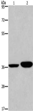 Gel: 6%SDS-PAGE,Lysate: 40 μg,Lane 1-2: Hela cells, A549 cells,Primary antibody: CSB-PA229662(APAF1 Antibody) at dilution 1/350 dilution,Secondary antibody: Goat anti rabbit IgG at 1/8000 dilution,Exposure time: 5 minutes