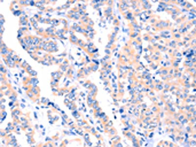 The image on the left is immunohistochemistry of paraffin-embedded Human thyroid cancer tissue using CSB-PA504012(APBA2 Antibody) at dilution 1/80, on the right is treated with synthetic peptide. (Original magnification: ×200)