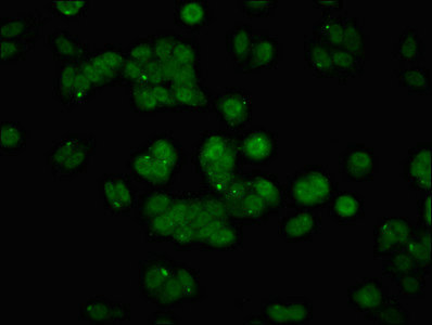 Immunofluorescent analysis of HepG2 cells using CSB-PA05559A0Rb at dilution of 1:100 and Alexa Fluor 488-congugated AffiniPure Goat Anti-Rabbit IgG(H+L)