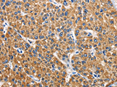 The image on the left is immunohistochemistry of paraffin-embedded Human liver cancer tissue using CSB-PA165028(APLNR Antibody) at dilution 1/40, on the right is treated with fusion protein. (Original magnification: ×200)