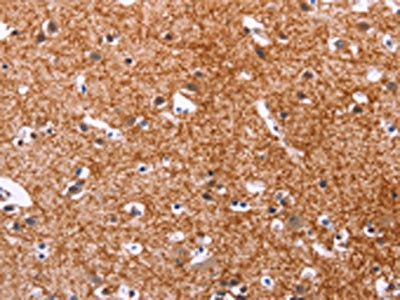 The image on the left is immunohistochemistry of paraffin-embedded Human brain tissue using CSB-PA165039(APMAP Antibody) at dilution 1/30, on the right is treated with synthetic peptide. (Original magnification: ×200)