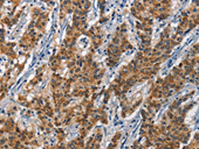 The image on the left is immunohistochemistry of paraffin-embedded Human gastic cancer tissue using CSB-PA082663(APOL1 Antibody) at dilution 1/40, on the right is treated with synthetic peptide. (Original magnification: ×200)