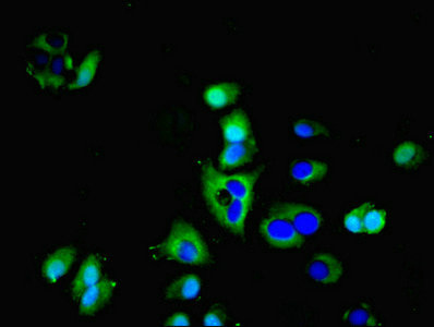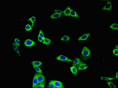 Immunofluorescent analysis of HepG2 cells using CSB-PA13909A0Rb at dilution of 1:100 and Alexa Fluor 488-congugated AffiniPure Goat Anti-Rabbit IgG(H+L)