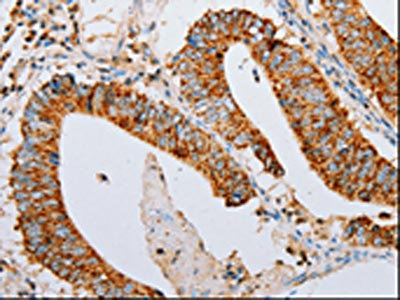 The image on the left is immunohistochemistry of paraffin-embedded Human colon cancer tissue using CSB-PA088834(ARF6 Antibody) at dilution 1/15, on the right is treated with synthetic peptide. (Original magnification: ×200)