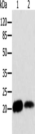 Gel: 12%SDS-PAGE, Lysate: 40 μg, Lane 1-2: HepG2 cells, 231 cells, Primary antibody: CSB-PA088834(ARF6 Antibody) at dilution 1/300, Secondary antibody: Goat anti rabbit IgG at 1/8000 dilution, Exposure time: 1 minute