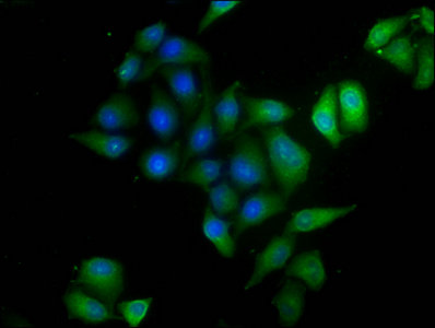 Immunofluorescence staining of Hela cells with CSB-PA002003LA01HU at 1:120,counter-stained with DAPI. The cells were fixed in 4% formaldehyde, permeabilized using 0.2% Triton X-100 and blocked in 10% normal Goat Serum. The cells were then incubated with the antibody overnight at 4°C.The secondary antibody was Alexa Fluor 488-congugated AffiniPure Goat Anti-Rabbit IgG (H+L).