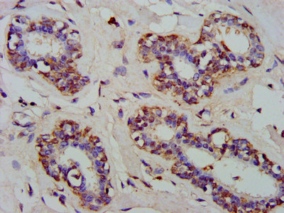 IHC image of CSB-PA621696LA01HU diluted at 1:300 and staining in paraffin-embedded human breast cancer performed on a Leica BondTM system. After dewaxing and hydration, antigen retrieval was mediated by high pressure in a citrate buffer (pH 6.0). Section was blocked with 10% normal goat serum 30min at RT. Then primary antibody (1% BSA) was incubated at 4°C overnight. The primary is detected by a biotinylated secondary antibody and visualized using an HRP conjugated SP system.