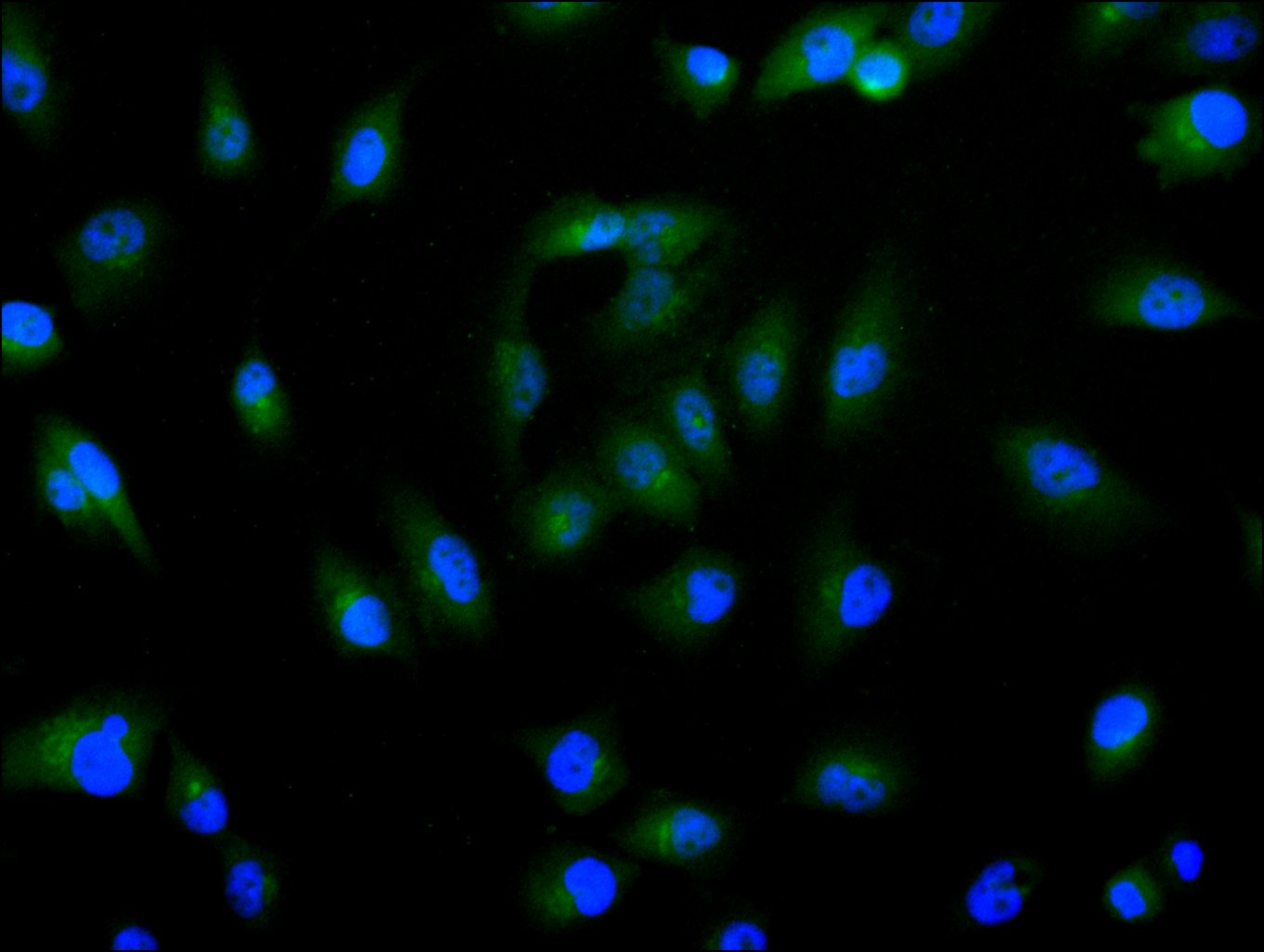 Immunofluorescence staining of A431 cell with CSB-PA681475LA01HU at 1:130, counter-stained with DAPI. TheCcells wereCfixed in 4% formaldehyde and blocked in 10% normal Goat Serum. The cells were then incubated with the antibody overnight at 4C. The secondary antibody was Alexa Fluor 488-congugated AffiniPure Goat Anti-Rabbit IgG(H+L).