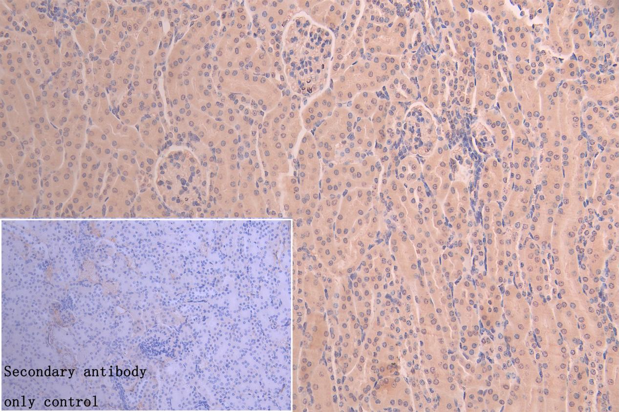 IHC image of CSB-PA681475LA01HU diluted at 1:200 and staining in paraffin-embedded mouse kidney tissue performed on a Leica BondTM system. After dewaxing and hydration, antigen retrieval was mediated by high pressure in a citrate buffer (pH 6.0). Section was blocked with 10% normal goat serum 30min at RT. Then primary antibody (1% BSA) was incubated at 4°C overnight. The primary is detected by a Goat anti-rabbit polymer IgG labeled by HRP and visualized using 0.05% DAB. Secondary antibody only control: uses 1% BSA instead of primary antibody