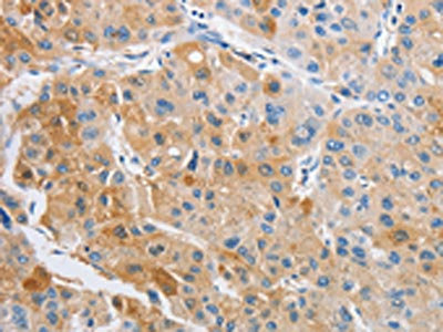 The image on the left is immunohistochemistry of paraffin-embedded Human liver cancer tissue using CSB-PA923194(ARHGAP5 Antibody) at dilution 1/25, on the right is treated with fusion protein. (Original magnification: ×200)