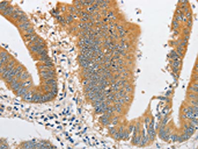 The image on the left is immunohistochemistry of paraffin-embedded Human colon cancer tissue using CSB-PA564021(ARHGAP5 Antibody) at dilution 1/30, on the right is treated with fusion protein. (Original magnification: ×200)
