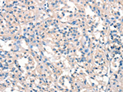 The image on the left is immunohistochemistry of paraffin-embedded Human thyroid cancer tissue using CSB-PA239750(ARHGEF11 Antibody) at dilution 1/25, on the right is treated with synthetic peptide. (Original magnification: ×200)