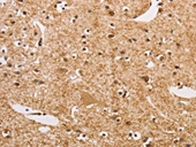 The image on the left is immunohistochemistry of paraffin-embedded Human brain tissue using CSB-PA091163(ARHGEF5 Antibody) at dilution 1/50, on the right is treated with fusion protein. (Original magnification: ×200)