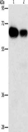 Gel: 8%SDS-PAGE, Lysate: 40 μg, Lane 1-2: Hela cells, K562 cells, Primary antibody: CSB-PA091163(ARHGEF5 Antibody) at dilution 1/1150, Secondary antibody: Goat anti rabbit IgG at 1/8000 dilution, Exposure time: 1 minute