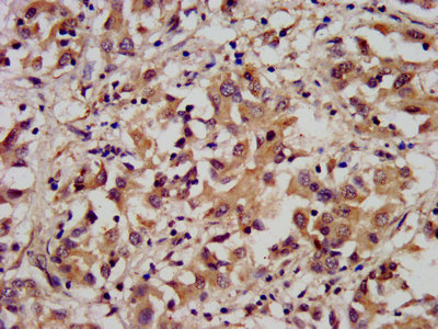 IHC image of CSB-PA002070LA01HU diluted at 1:300 and staining in paraffin-embedded human liver cancer performed on a Leica BondTM system. After dewaxing and hydration, antigen retrieval was mediated by high pressure in a citrate buffer (pH 6.0). Section was blocked with 10% normal goat serum 30min at RT. Then primary antibody (1% BSA) was incubated at 4°C overnight. The primary is detected by a biotinylated secondary antibody and visualized using an HRP conjugated SP system.