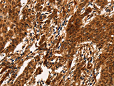 The image on the left is immunohistochemistry of paraffin-embedded Human gastric cancer tissue using CSB-PA157358(ARL6IP1 Antibody) at dilution 1/20, on the right is treated with fusion protein. (Original magnification: ×200)