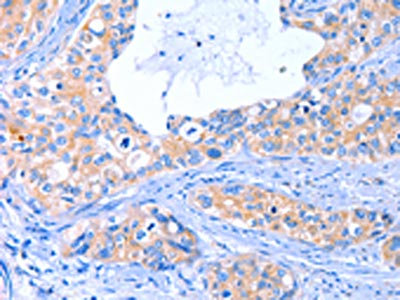 The image on the left is immunohistochemistry of paraffin-embedded Human cervical cancer tissue using CSB-PA133439(ARRB1 Antibody) at dilution 1/50, on the right is treated with fusion protein. (Original magnification: ×200)