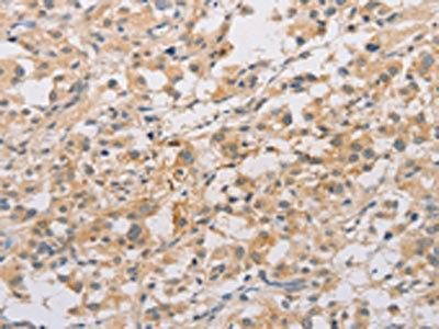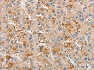 The image on the left is immunohistochemistry of paraffin-embedded Human liver cancer tissue using CSB-PA120422(ARSF Antibody) at dilution 1/20, on the right is treated with fusion protein. (Original magnification: ×200)