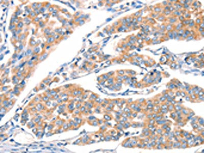 The image on the left is immunohistochemistry of paraffin-embedded Human breast cancer tissue using CSB-PA725796(ART4 Antibody) at dilution 1/30, on the right is treated with synthetic peptide. (Original magnification: ×200)