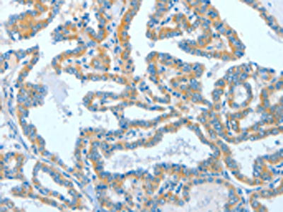 The image on the left is immunohistochemistry of paraffin-embedded Human thyroid cancer tissue using CSB-PA270829(ASCC1 Antibody) at dilution 1/50, on the right is treated with fusion protein. (Original magnification: ×200)