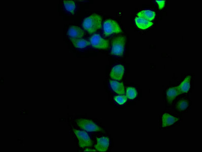 Immunofluorescence staining of Hela cells with CSB-PA002213LA01HU at 1:100, counter-stained with DAPI. The cells were fixed in 4% formaldehyde, permeabilized using 0.2% Triton X-100 and blocked in 10% normal Goat Serum. The cells were then incubated with the antibody overnight at 4°C. The secondary antibody was Alexa Fluor 488-congugated AffiniPure Goat Anti-Rabbit IgG(H+L).