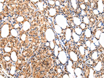 The image on the left is immunohistochemistry of paraffin-embedded Human thyroid cancer tissue using CSB-PA221484(ATF1 Antibody) at dilution 1/35, on the right is treated with synthetic peptide. (Original magnification: ×200)