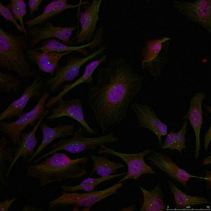 Immunofluorescence staining of methanol-fixed Hela cells using ATF2(Ab-71 or 53) Antibody.