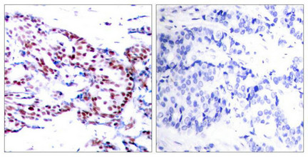 Immunohistochemical analysis of paraffin-embedded human breast carcinoma tissue using ATF2(Ab-71 or 53) Antibody(left) or the same antibody preincubated with blocking peptide(right).