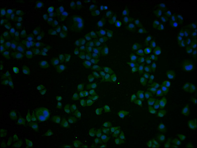 Immunofluorescence staining of Hela cells with CSB-PA002272LA01HU at 1:100, counter-stained with DAPI. The cells were fixed in 4% formaldehyde and blocked in 10% normal Goat Serum. The cells were then incubated with the antibody overnight at 4°C. The secondary antibody was Alexa Fluor 488-congugated AffiniPure Goat Anti-Rabbit IgG(H+L).