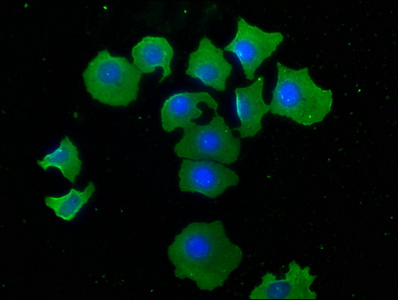 Immunofluorescence staining of A549 cells with CSB-PA883590LA01HU at 1:50, counter-stained with DAPI. The cells were fixed in 4% formaldehyde, permeabilized using 0.2% Triton X-100 and blocked in 10% normal Goat Serum. The cells were then incubated with the antibody overnight at 4°C. The secondary antibody was Alexa Fluor 488-congugated AffiniPure Goat Anti-Rabbit IgG(H+L).