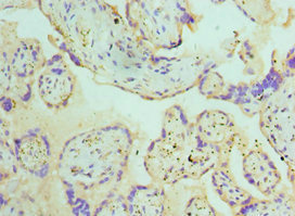 Immunohistochemistry of paraffin-embedded human placenta tissue using CSB-PA734569ESR1HU at dilution of 1:100