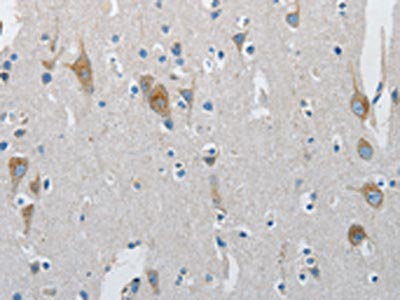 The image on the left is immunohistochemistry of paraffin-embedded Human brain tissue using CSB-PA547032(ATG4A Antibody) at dilution 1/30, on the right is treated with synthetic peptide. (Original magnification: ×200)