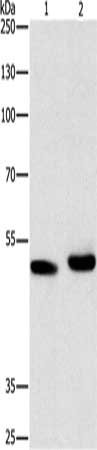 Gel: 10%SDS-PAGE, Lysate: 40 μg, Lane 1-2: 231 cells, human liver cancer tissue, Primary antibody: CSB-PA547032(ATG4A Antibody) at dilution 1/300, Secondary antibody: Goat anti rabbit IgG at 1/8000 dilution, Exposure time: 10 minutes