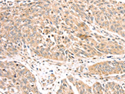 The image on the left is immunohistochemistry of paraffin-embedded Human lung cancer tissue using CSB-PA781114(ATOX1 Antibody) at dilution 1/30, on the right is treated with fusion protein. (Original magnification: ×200)
