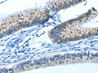 The image on the left is immunohistochemistry of paraffin-embedded Human colon cancer tissue using CSB-PA695367(ATP1A1 Antibody) at dilution 1/35, on the right is treated with synthetic peptide. (Original magnification: ×200)