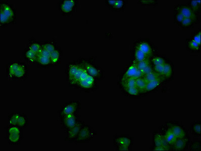 Immunofluorescent analysis of HepG2 cells using CSB-PA002332LA01HU at dilution of 1:100 and Alexa Fluor 488-congugated AffiniPure Goat Anti-Rabbit IgG(H+L)