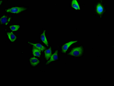 Immunofluorescence staining of A549 cells with CSB-PA002468LA01HU at 1:133, counter-stained with DAPI. The cells were fixed in 4% formaldehyde, permeabilized using 0.2% Triton X-100 and blocked in 10% normal Goat Serum. The cells were then incubated with the antibody overnight at 4°C. The secondary antibody was Alexa Fluor 488-congugated AffiniPure Goat Anti-Rabbit IgG(H+L).