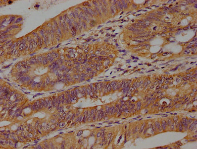 IHC image of CSB-PA897472OA01HU diluted at 1:100 and staining in paraffin-embedded human colon cancer performed on a Leica BondTM system. After dewaxing and hydration, antigen retrieval was mediated by high pressure in a citrate buffer (pH 6.0). Section was blocked with 10% normal goat serum 30min at RT. Then primary antibody (1% BSA) was incubated at 4°C overnight. The primary is detected by a biotinylated secondary antibody and visualized using an HRP conjugated SP system.