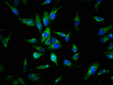 Immunofluorescence staining of Hela cells with CSB-PA326981LA01HU at 1:144, counter-stained with DAPI. The cells were fixed in 4% formaldehyde, permeabilized using 0.2% Triton X-100 and blocked in 10% normal Goat Serum. The cells were then incubated with the antibody overnight at 4°C. The secondary antibody was Alexa Fluor 488-congugated AffiniPure Goat Anti-Rabbit IgG(H+L).