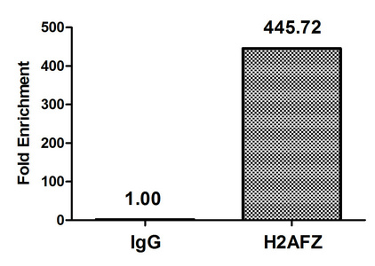 Chromatin Immunoprecipitation Hela (4*106, treated with 30mM sodium butyrate for 4h) were treated with Micrococcal Nuclease, sonicated, and immunoprecipitated with 5µg anti-H2AFZ (CSB-PA010100OA04acHU) or a control normal rabbit IgG. The resulting ChIP DNA was quantified using real-time PCR with primers against the β-Globin promoter.