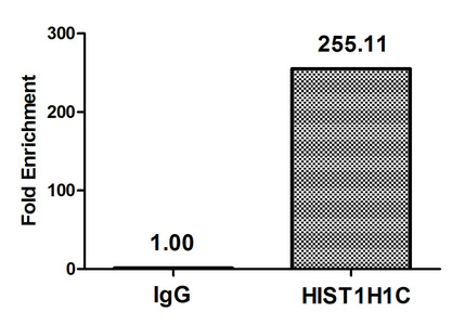 Chromatin Immunoprecipitation Hela (4*106, treated with 30mM sodium butyrate for 4h) were treated with Micrococcal Nuclease, sonicated, and immunoprecipitated with 8µg anti-HIST1H1C (CSB-PA010378PA96acHU) or a control normal rabbit IgG. The resulting ChIP DNA was quantified using real-time PCR with primers against the β-Globin promoter.