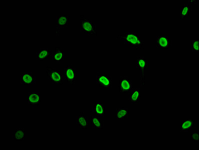 Immunofluorescence staining of Hela cells (treated with 30mM sodium butyrate for 4h) with CSB-PA010389OA74acHU at 1:2.5, counter-stained with DAPI. The cells were fixed in 4% formaldehyde, permeabilized using 0.2% Triton X-100 and blocked in 10% normal Goat Serum. The cells were then incubated with the antibody overnight at 4°C. The secondary antibody was Alexa Fluor 488-congugated AffiniPure Goat Anti-Rabbit IgG(H+L).