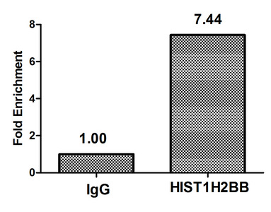 Chromatin Immunoprecipitation Hela (4*106) were treated with Micrococcal Nuclease, sonicated, and immunoprecipitated with 8µg anti-HIST1H2BB (CSB-PA010402OA16acHU) or a control normal rabbit IgG. The resulting ChIP DNA was quantified using real-time PCR with primers against the β-Globin promoter.
