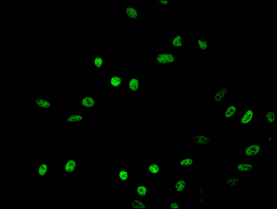 Immunofluorescent analysis of Hela cells treated with NaB using CSB-PA010402OA16acHU at dilution of 1:100 and Alexa Fluor 488-congugated AffiniPure Goat Anti-Rabbit IgG(H+L)