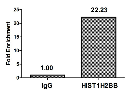 Chromatin Immunoprecipitation Hela (4*106, treated with 30mM sodium butyrate for 4h) were treated with Micrococcal Nuclease, sonicated, and immunoprecipitated with 8µg anti-HIST1H2BB (CSB-PA010402NA05acHU) or a control normal rabbit IgG. The resulting ChIP DNA was quantified using real-time PCR with primers against the β-Globin promoter.