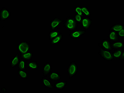 Immunofluorescence staining of Hela cells (treated with 30mM sodium butyrate for 4h) with CSB-PA010403OA12acHU at 1:5, counter-stained with DAPI. The cells were fixed in 4% formaldehyde, permeabilized using 0.2% Triton X-100 and blocked in 10% normal Goat Serum. The cells were then incubated with the antibody overnight at 4°C. The secondary antibody was Alexa Fluor 488-congugated AffiniPure Goat Anti-Rabbit IgG(H+L).